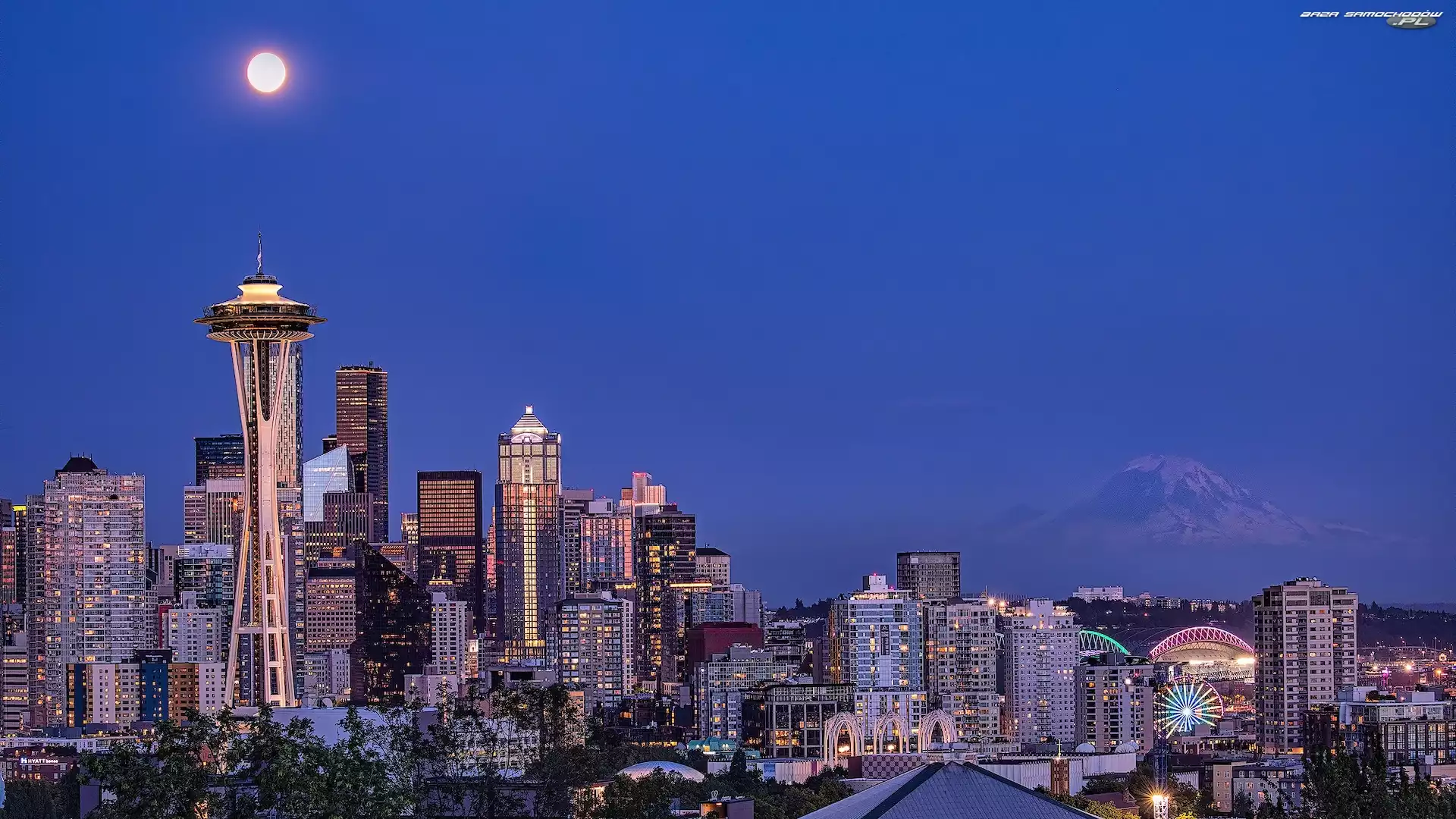 Pełnia, Wieża, Stany Zjednoczone, Księżyc, Wieżowce, Seattle, Stan Waszyngton, Space Needle- Zdjęcia samochodów |